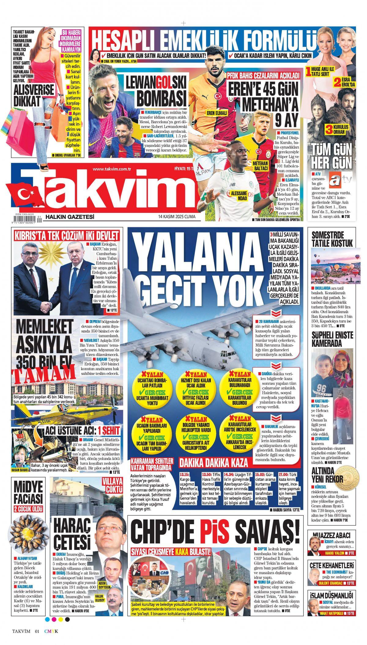 Takvim Gazetesi 14 Kasım 2025 Günü Manşeti