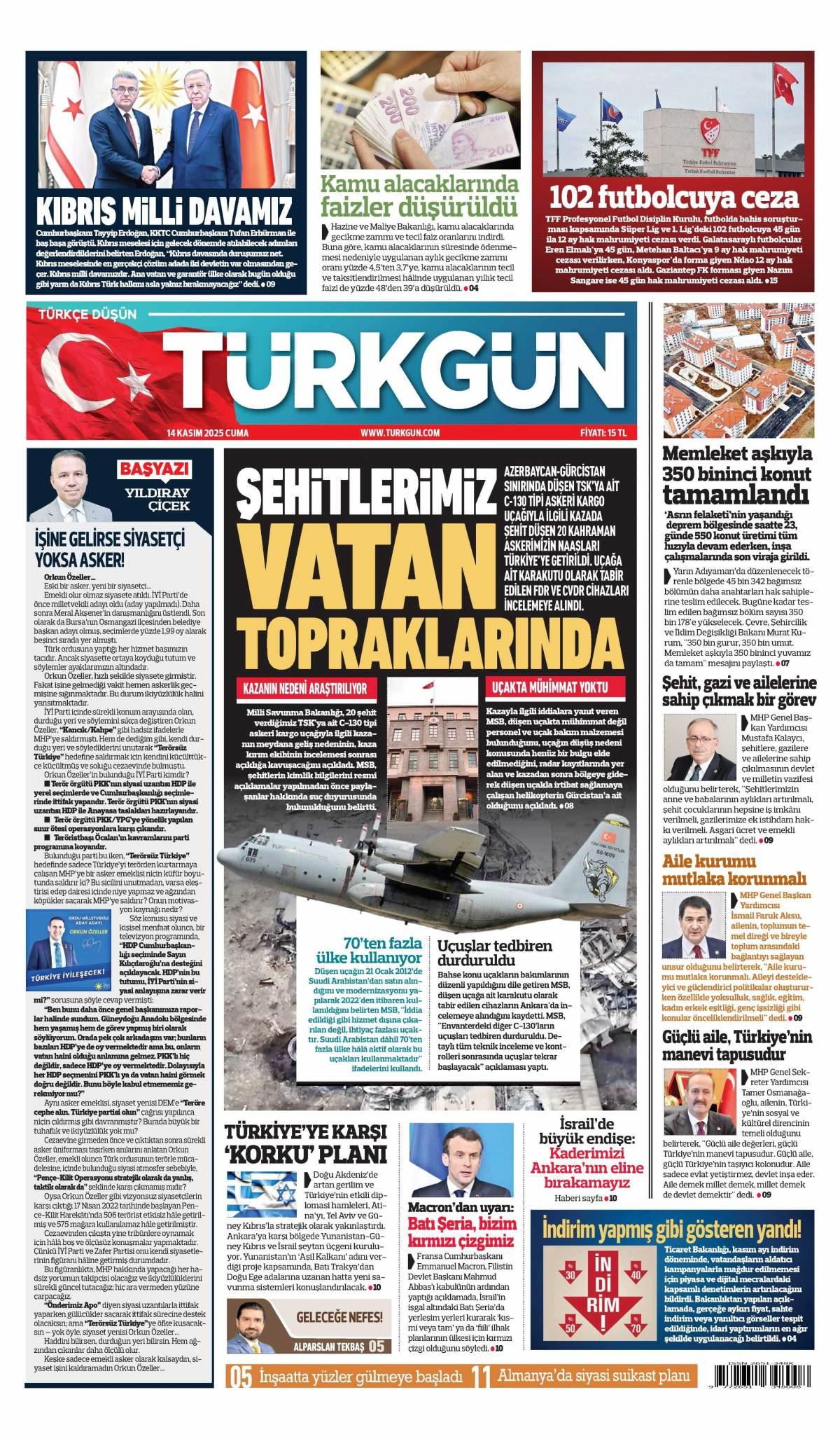 Türkgün Gazetesi 14 Kasım 2025 Günü Manşeti