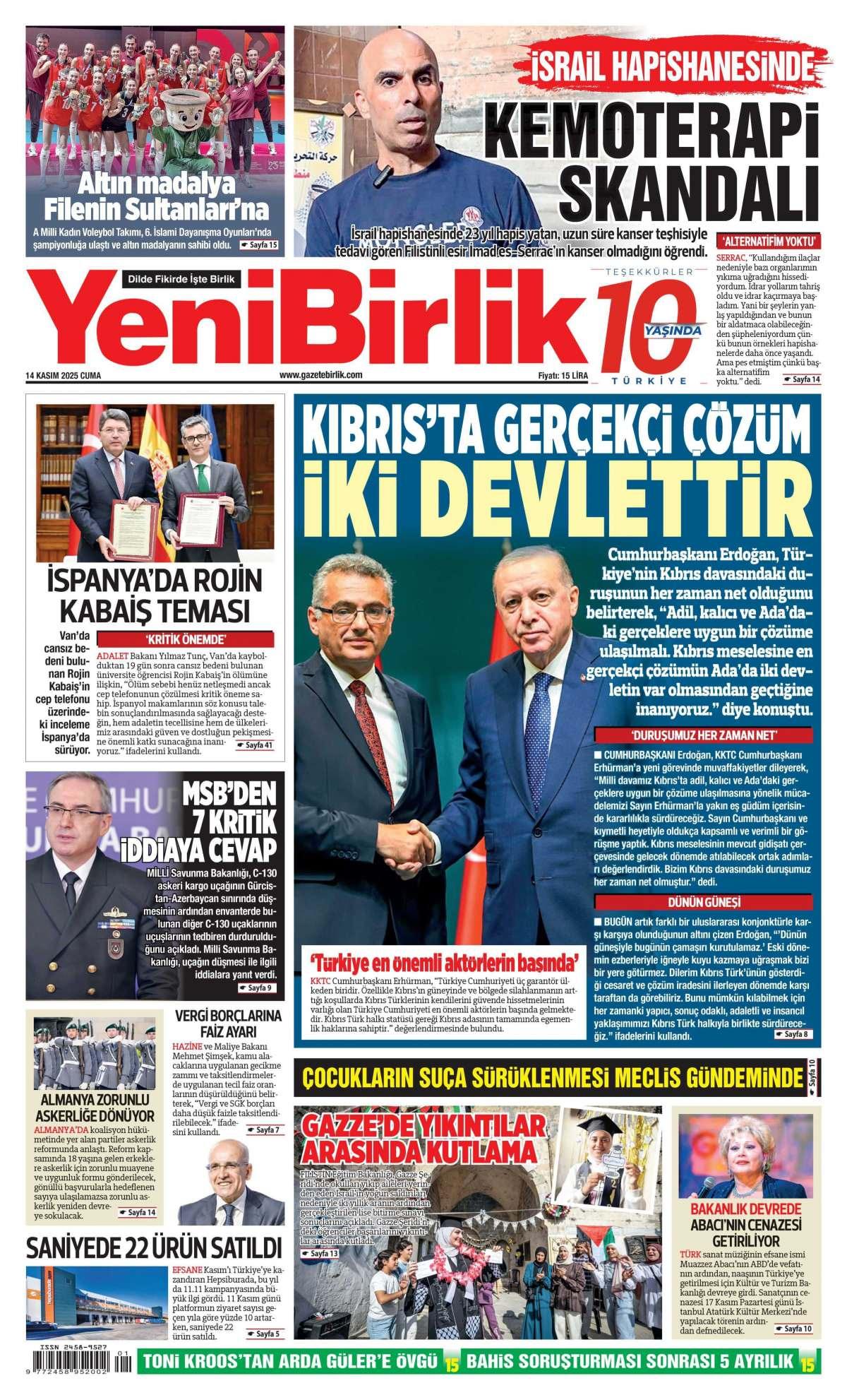 Yeni Birlik Gazetesi 14 Kasım 2025 Günü Manşeti